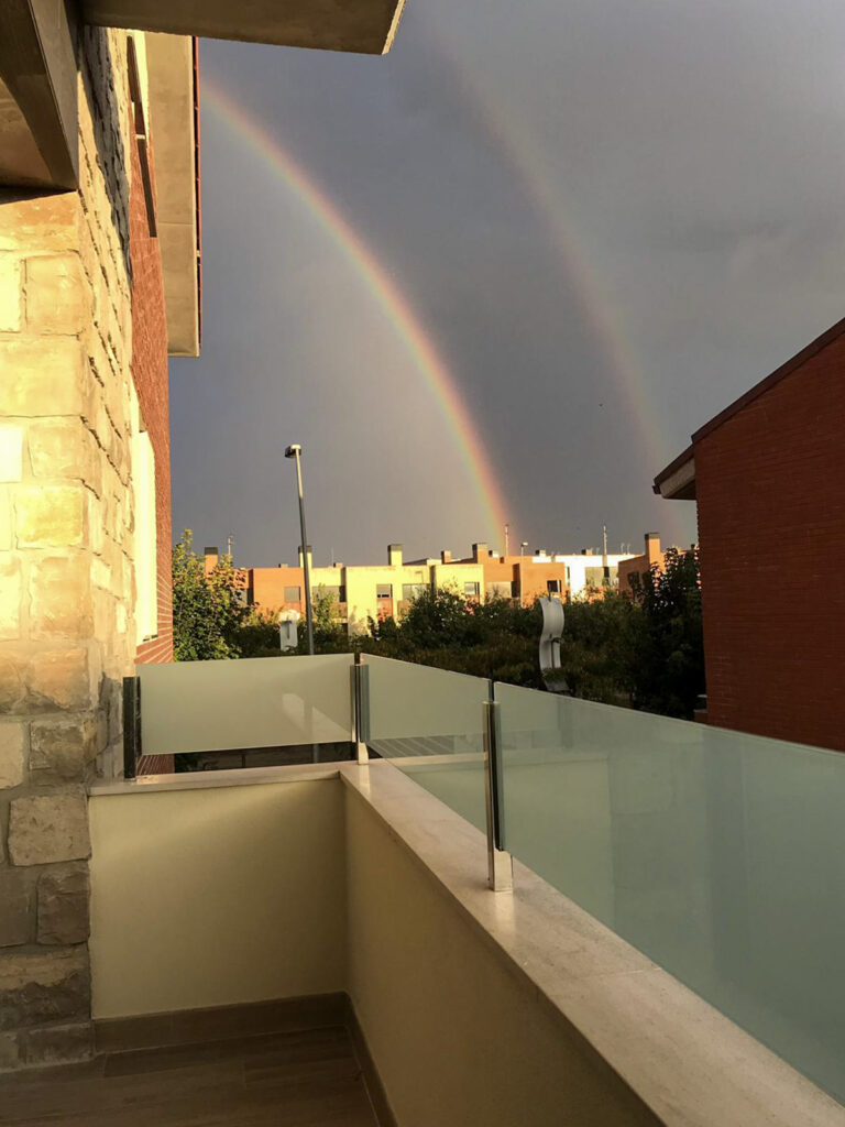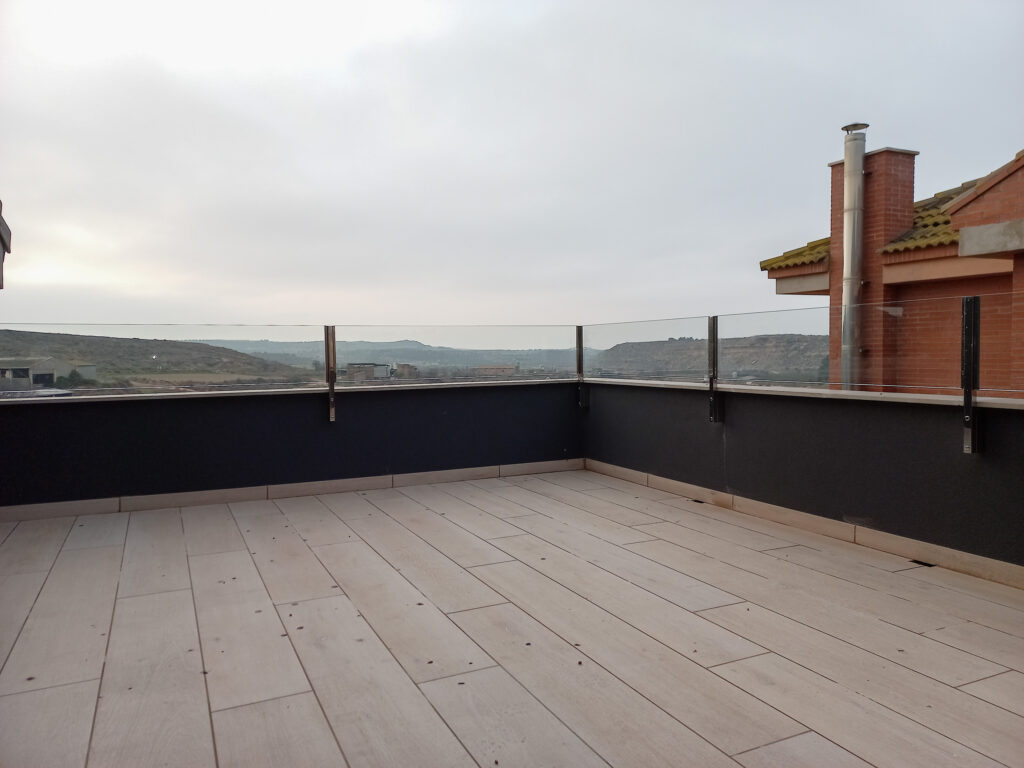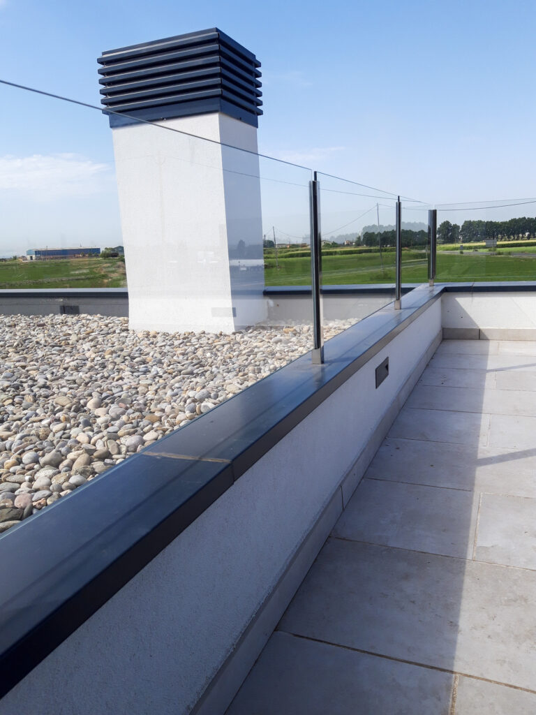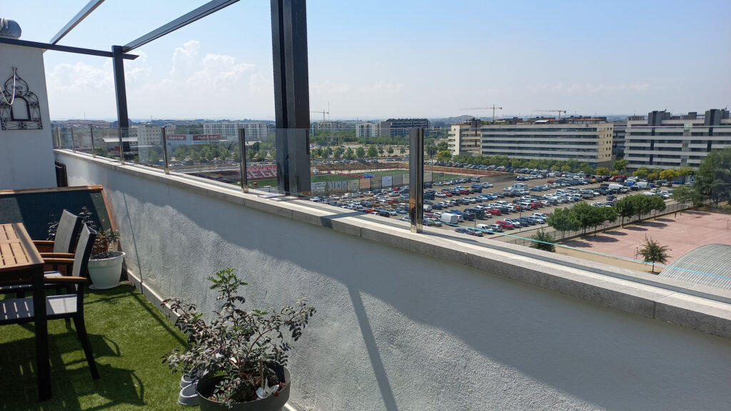 Estructura d’acer inoxidable i vidre laminat sobre mur per mantenir vistes i lluminositat sense renunciar a la seguretat. Ideal per a terrasses i balcons.