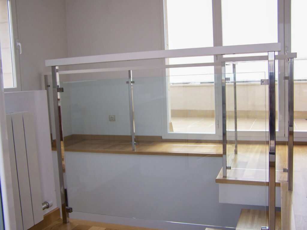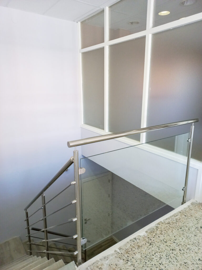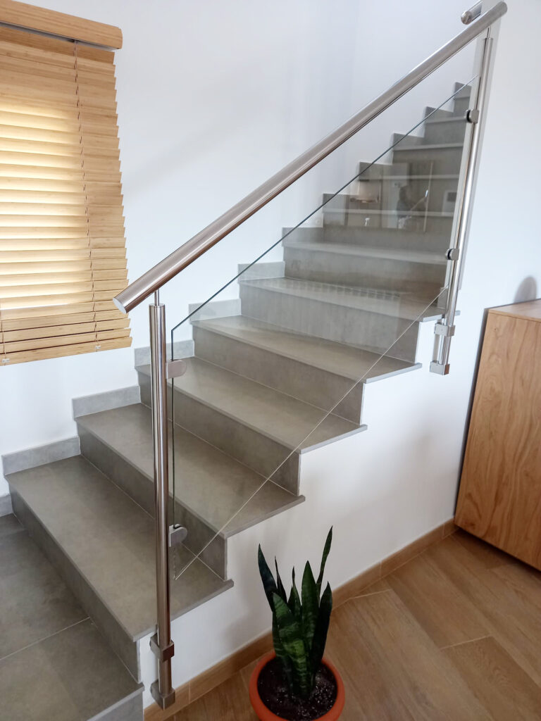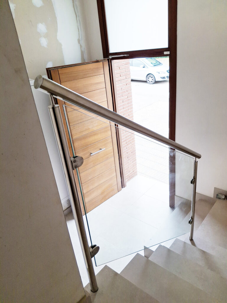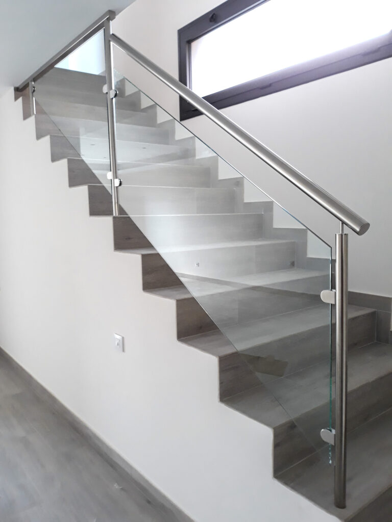 Estructura d’acer inoxidable combinada amb vidre laminat, ideal per potenciar la llum i la sensació d’amplitud. Una opció elegant i segura, amb passamà d’inox o de fusta.