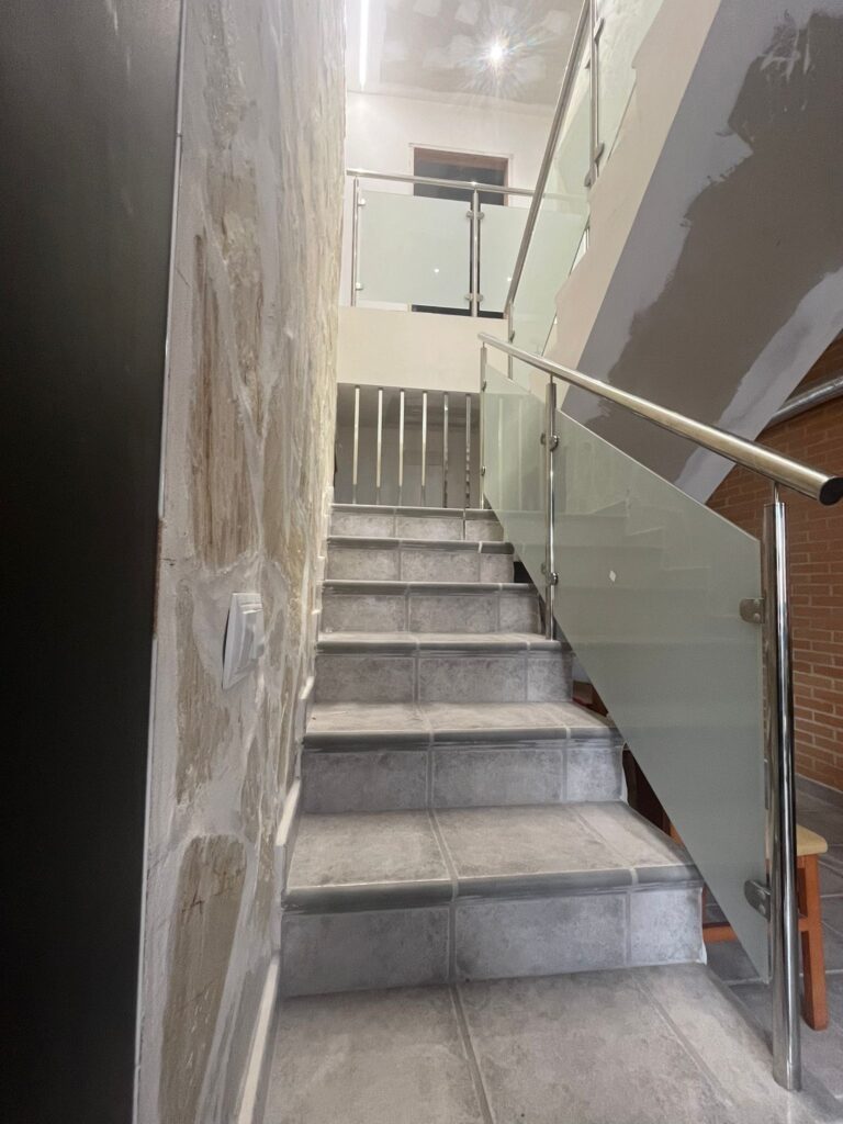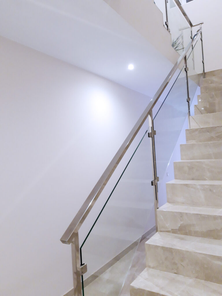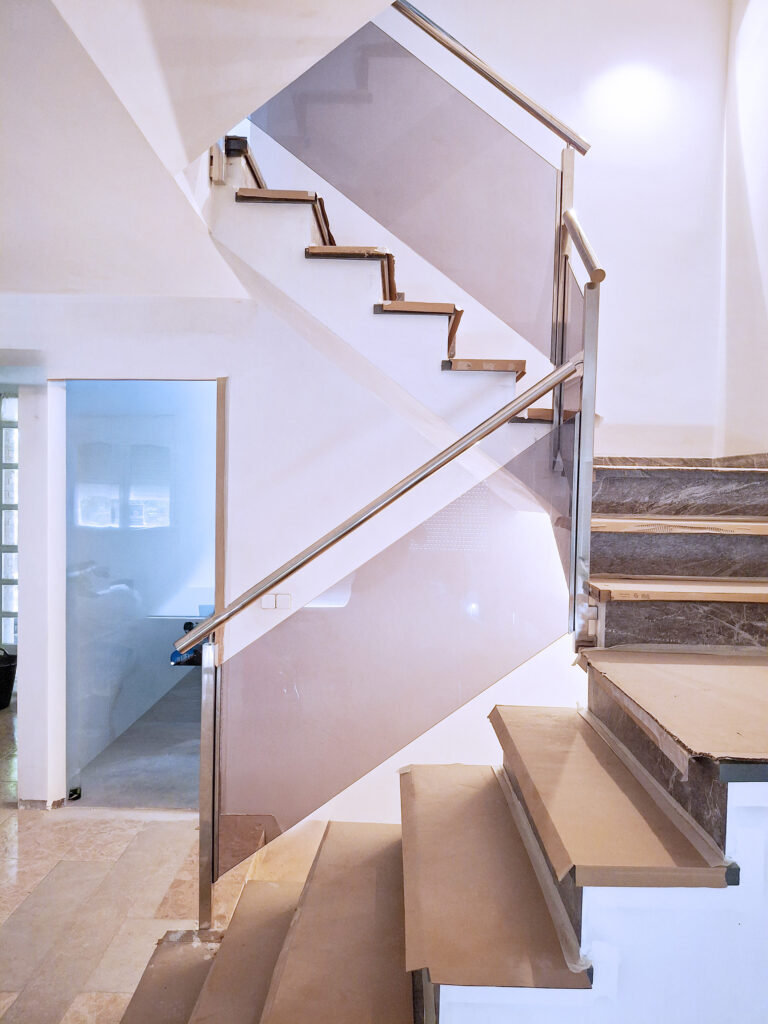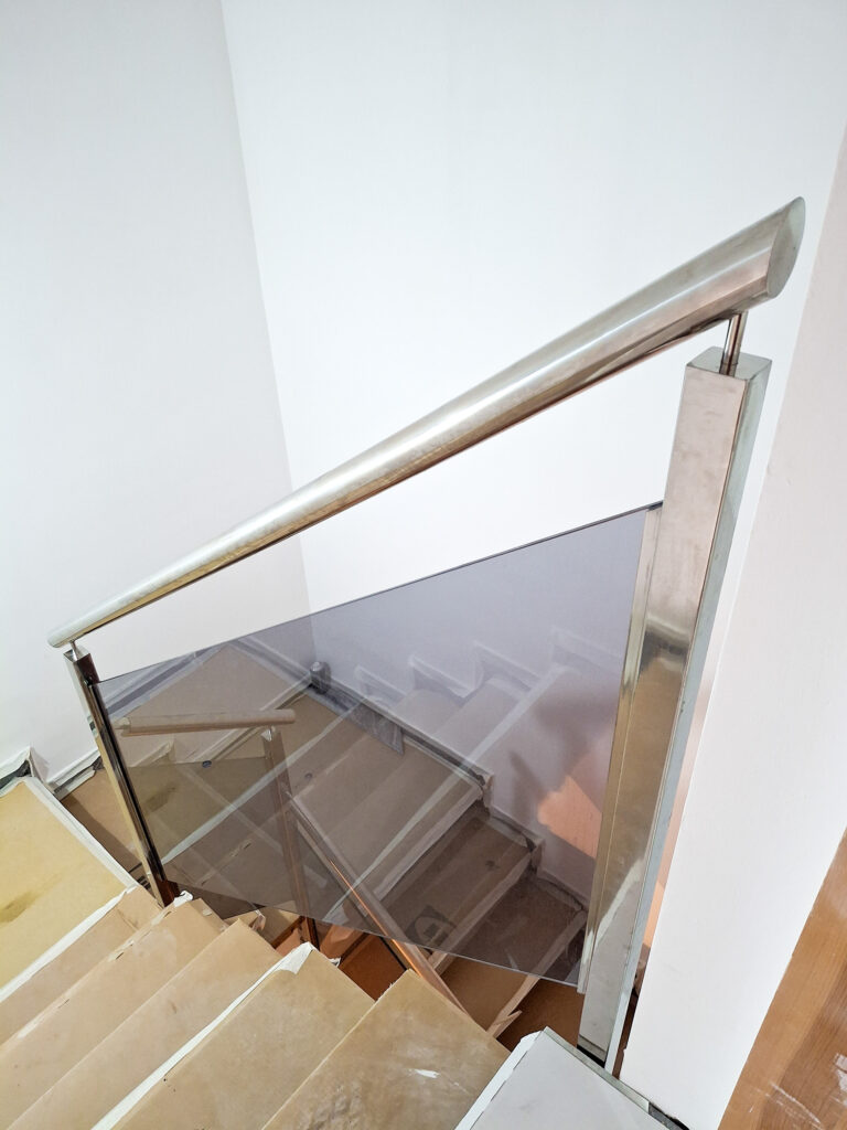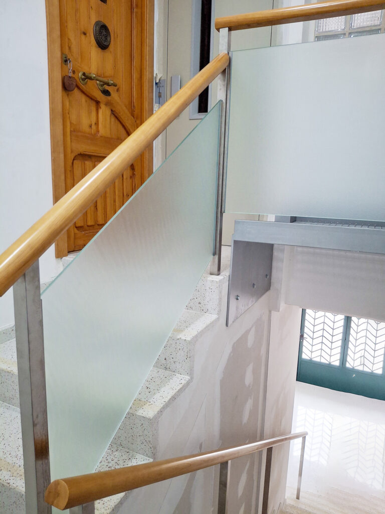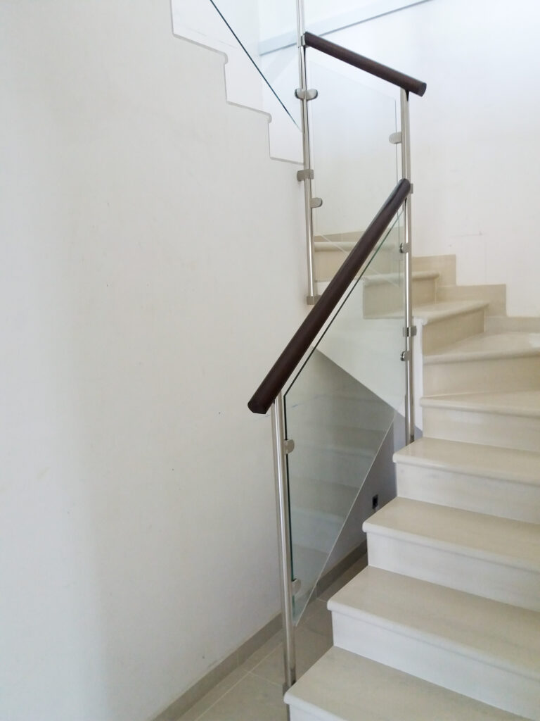 Estructura d’acer inoxidable combinada amb vidre laminat, ideal per potenciar la llum i la sensació d’amplitud. Una opció elegant i segura, amb passamà d’inox o de fusta.