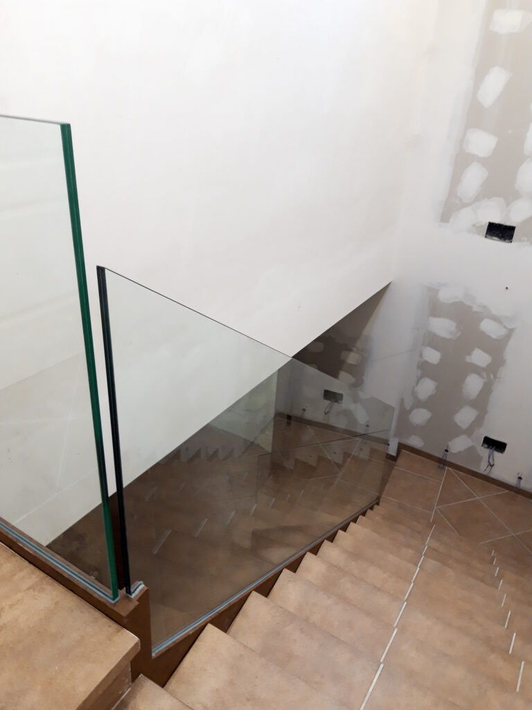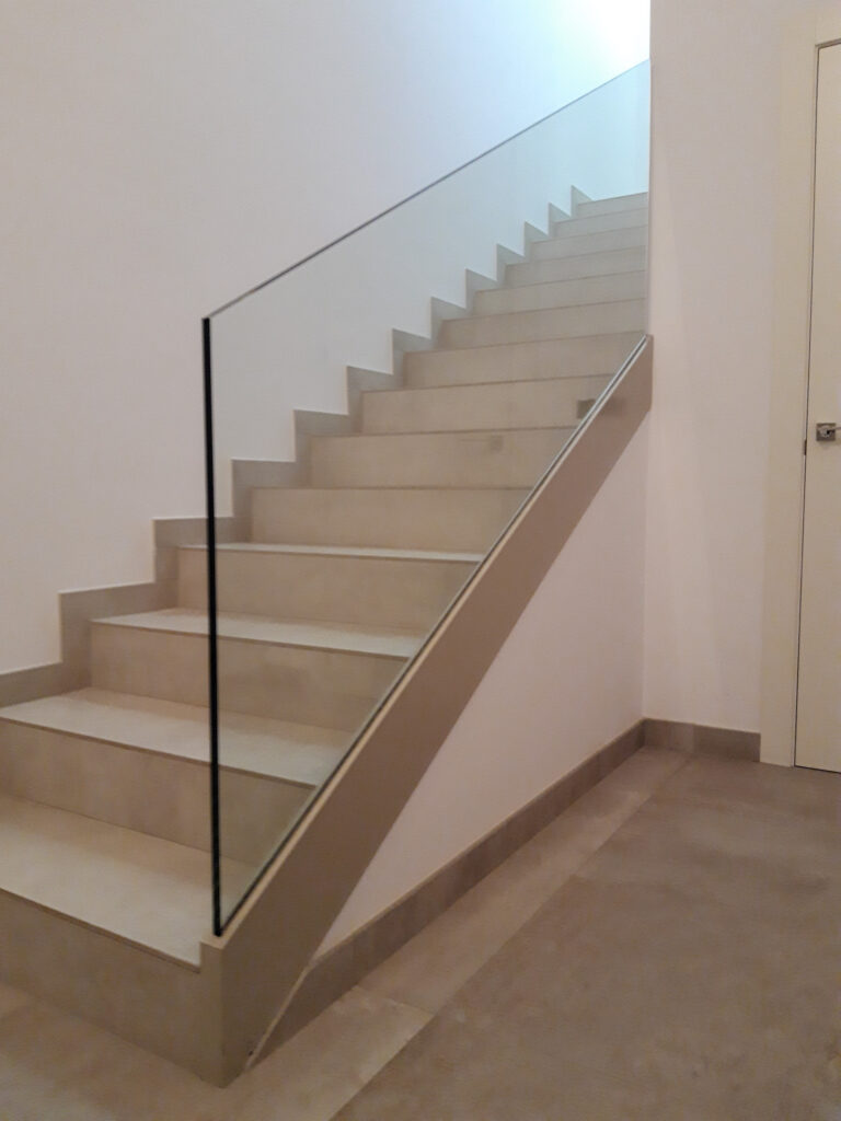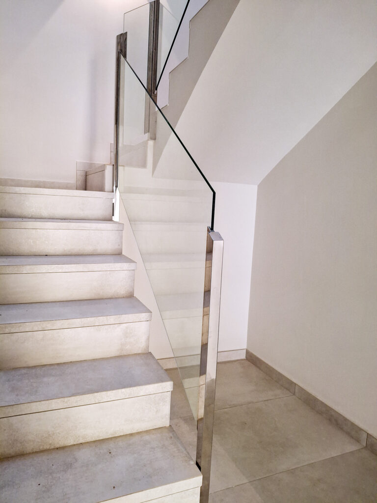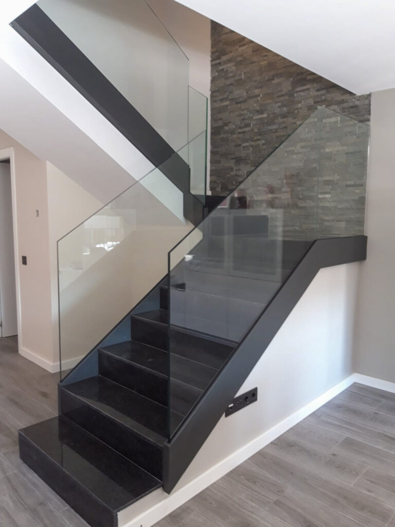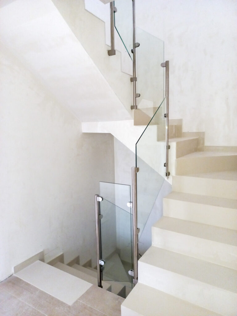 Estructura d’acer inoxidable combinada amb vidre laminat, ideal per potenciar la llum i la sensació d’amplitud. Una opció elegant i segura, sense passamans.